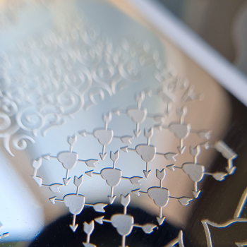در شابلونهای A&E، پترنها با حکاکی یکنواخت و عمق استاندارد ساخته شدهاند؛ نه آنقدر کمعمق که لاک داخل آن نایستد و طرح نصفه منتقل شود، و نه آنقدر عمیق که اسکرپر نتواند لاک اضافی را کامل جمع کند.