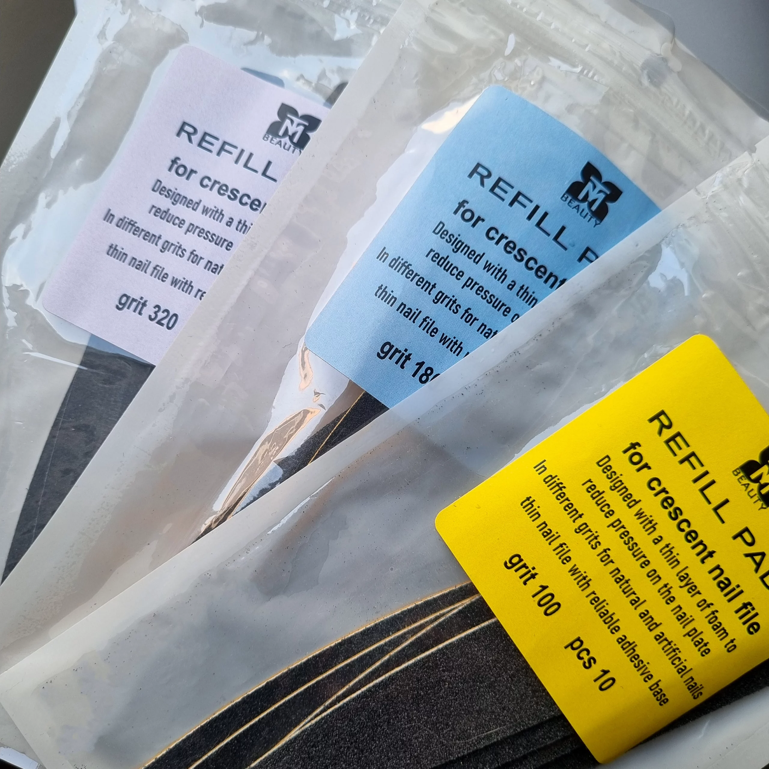 هر بسته شامل ۱۰ عدد یدک است که همگی دارای یک گرید مشخص هستند (100 یا 180 یا 320). این موضوع به ناخنکار کمک میکند هر گرید را بهصورت تخصصی و منظم در مراحل مختلف کار استفاده کند.